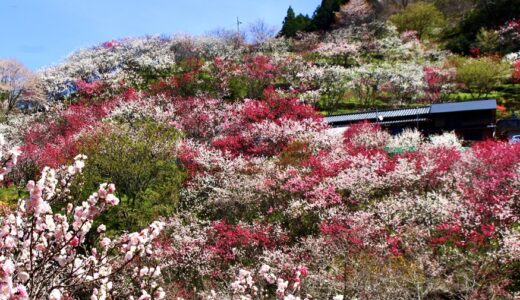 山間部に白・紅・ピンクの花桃が咲く様子はまさに桃源郷のようです。
